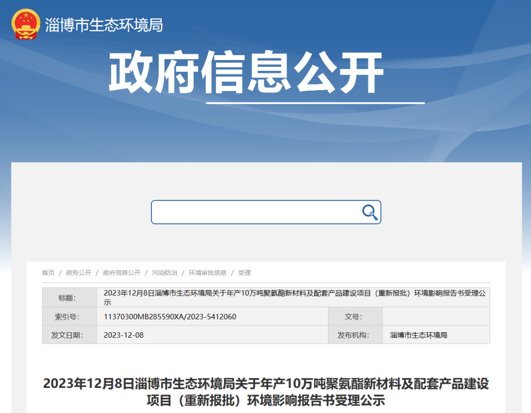 Recently, the Zibo Municipal Ecological Environment Bureau issued an announcement on the acceptance of the environmental impact report of the construction project (resubmission for approval) with an annual output of 100,000 tons of new polyurethane materials and supporting products.