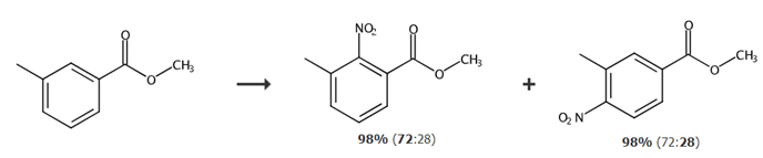 Add 4.8mL 65% nitric acid (0.07moL) into a 100mL round-bottomed flask, add 7.6mL (0.08moL) acetic anhydride dropwise, and finish the dripping. After 0.5h reaction, add 7.6mL acetic anhydride, 5.4mL acetic acid, 3.0g3 -After mixing, methyl methyl benzoate (0.02moL) was slowly added dropwise to the reaction system. The above operations were all performed under ice bath conditions. After the dripping is completed, raise the temperature to 30°C and react for 3 hours. After stopping the reaction, evaporate acetic anhydride, nitric acid and the generated glacial acetic acid. Pour the concentrated solution into ice water and stir. A yellow solid will precipitate. Add 20mL of ethyl acetate to adhere to the solution. The product on the wall of the bottle was dissolved, separated and concentrated to obtain 3.83g of light yellow liquid with a yield of 98.21%. After HPLC analysis, the content ratio of methyl 3-methyl-2-nitrobenzoate to methyl 3-methyl-4-nitrobenzoate was 72:28.