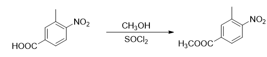 Add 300g 3-methyl-4-nitrobenzoic acid (1.66mol) and 1000mL methanol into a dry 3L three-necked flask equipped with a reflux condenser and a thermometer, and make a simple exhaust gas absorption device on the reflux condenser. The absorption liquid is NaOH aqueous solution. Under electromagnetic stirring, add 100g of thionyl chloride (0.85 mol) drop by drop using a constant pressure dropping funnel. Control the temperature of the reaction solution during the dropping process to be between 30-40°C. At this time, the reaction solution will be a milky white solution. After about 45 minutes, the dropwise addition is completed, and the temperature is raised to 60°C. At this time, the reactant becomes a yellow clear and transparent solution. Stir and reflux the reaction for 2 hours at this temperature, stop heating, and slowly cool the reaction solution. When it reaches 50°C, a large amount of solid precipitates. Continue to cool down to 30℃, add 1000mL water to the reaction solution, stir for about half an hour until no more gas is released, filter the reactant, wash the obtained filter cake with 100mL×3 water, and dry it at 40℃ to obtain 314g of yellow powder. Solid, yield 97.2%, m.p. 80~82°C.