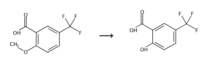 Place 2-methoxy-5-(trifluoromethyl)benzoic acid (5.00g, 22.71mmol) in a flask containing iodocyclohexane (29.4mL, 227mmol) and DMF (25mL). The reaction mixture was refluxed for 4 h, cooled, and the solvent was removed in vacuo. The crude product was purified by silica gel chromatography eluting with 0-100% EtOAc in isohexane to afford the title compound, 2-hydroxy-5-trifluoromethylbenzoic acid. 1HNMR (400MHz, CDCl3) δ10.70 (1H, s), 8.29 (1H, d), 7.80 (1H, dd), 7.15 (1H, d ).