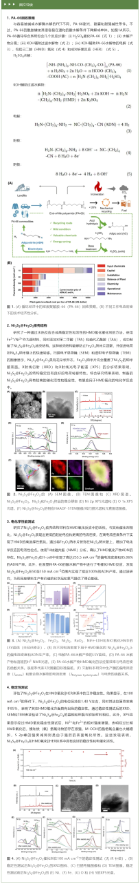 Recently, the team of Professor Li Chunzhong and Associate Professor Li Yuhang of East China University of Science and Technology proposed a series reaction strategy. Through hydrolysis and electrolysis, ADN and adipic acid (AC) can be extracted from waste PA-66 under mild conditions. ) and hydrogen (H2). The core-shell structure anode catalyst Ni3S2@Fe2O3 is designed with Fe2O3 nanosheets on Ni2S3 nanowalls to dehydrogenate C-N bonds into C≡N bonds. In the 100-hour stability test, the Ni3S2@Fe2O3 electrode