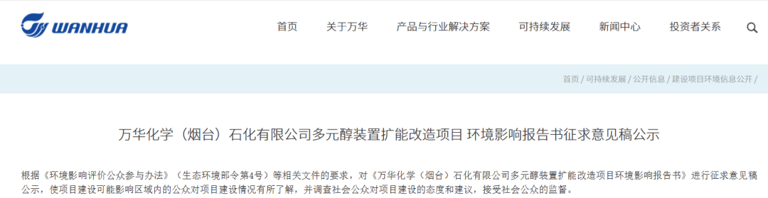 Recently, the draft environmental impact report of Wanhua Chemical (Yantai) Petrochemical Co., Ltd.’s polyol unit expansion and transformation project was released for public comment.