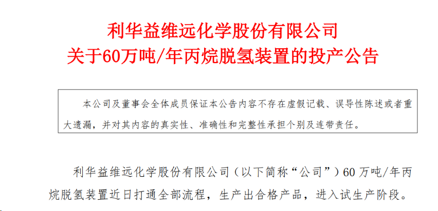 On November 21, Weiyuan Co., Ltd. announced that the 600,000 tons/year propane dehydrogenation unit has recently completed all processes, produced qualified products, and entered the trial production stage.
