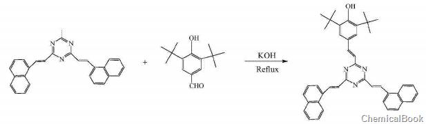 Weigh 1 mole of 3,5-di-tert-butyl-p-hydroxybenzaldehyde and 1.8 mole of potassium hydroxide, then add 20L of methanol to dissolve. Add 5L of 1 molar 1,3,5-trimethyl-s-triazine solution into the flask drop by drop. After the drops are completed, reflux for another 30 hours. Use a rotary evaporator to remove the solvent and the residue with V( Benzene): V (ethanol) = 10:1 toluene-ethanol mixture was used as the eluent, and the yellow powder product was obtained through silica gel column chromatography with a yield of 30.4%, which was confirmed by FTIR, MALDI-TOP, 1HNMR and other methods. The structure of this compound. IR(KBr)ν: 3626, 3063, 3029, 2905, 2026, 1453~1641, 1050, 760~830cm-1; Autoflex III MALDI-TOF mass spectrometer was used to measure its mass spectrum, and its molecular ion peak was 616 (M+H )+. The internal standard substance for NMR measurement was TMS, the solvent was DMSO-D6, and a DRX-400MHz NMR instrument was used. Chemical shift δ: 1.45 (S, 8H), 7.12~7.16 (6H, C=C-H conjugated with the aromatic ring), 7.18~8.44 (m, 16H, hydrogen on the aromatic ring), 9.76 (S, 1H, phenol Hydroxy hydrogen); elemental analysis uses PerkinElmer2400 analyzer, and its molecular formula is C43H41N3O: The theoretical mass percentage of each element is: C83.87; H6.71; N6.82; O2.60; the measured value is C83.69; H6.89; N6 .70; O2.73.