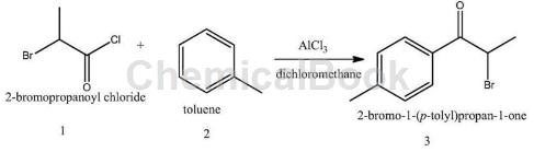 2-Bromo-4′-methylpropiophenone is prepared as follows: (1) Under argon protection, add (4g, 30mmol) anhydrous aluminum chloride to the reaction bottle, and then add 20ml of anhydrous dichloromethane , stir to dissolve. After dissolving, add (1.7g, 10mmol) 2-bromopropionyl chloride and continue stirring for 20 minutes. Then add (0.92g, 10mmol) toluene and complete the dropwise addition within 30 minutes. After the dropwise addition is completed, reflux for 2 hours. After the reflux is completed, cool to room temperature. After cooling, pour the solution into 40 ml of ice water, add 20 ml of methylene chloride and 20 ml of 6N hydrochloric acid, shake vigorously and then separate into layers. After layering, the lower methylene chloride phase was left. After washing the methylene chloride phase twice with 1NHCL, it was dried over anhydrous magnesium sulfate, filtered, and rotary evaporated to obtain a transparent oily substance. The transparent substance was placed in a crystallizing dish and ether was added to dissolve it, then petroleum ether was slowly added dropwise until slightly turbid, covered with a piece of paper and left to crystallize in a fume hood to obtain 1.37g of the product 2-bromo-4′-methyl. Transparent crystals of phenylacetone. Yield 60.6% 13CNMR (DMSO) δ: 192.562, 144.674, 134.845, 129.242, 129.025, 41.009, 22.502, 20.963ESIm/z=227 (M+1).