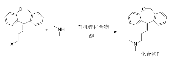 (8) Perform a nucleophilic substitution reaction between the halide and dimethylamine by adding an organic lithium compound in an ether solvent to obtain doxepin (compound F).