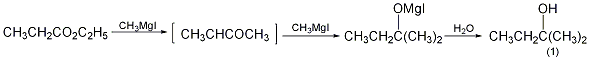 Methyl magnesium iodide prepared by reacting 102g (1.0mol) of ethyl propionate (2) and 49g (2mol) iron filings and 284g (2.0mol) methyl iodide, according to the above 2-methyl magnesium iodide The operating method of -2-pentanol is to collect the fraction between 100 and 102°C to obtain 2-methyl-2-butanol (1). [1]