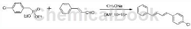 Preparation process: Add the product in 1 (39.4g, 0.15mol) to 100ml dry DMF, add 28% sodium methoxide (28.9g, 0.15mol) to the above solution, stir evenly, and add cinnamaldehyde (15.8g, 0.12mol)/DMF (10ml) solution was added to the mixture. After stirring at room temperature for 10~15h, the mixture was poured into 300ml of water, and a small amount of HCl solution was added to obtain a large amount of white solid. Filter it and use 20ml of methanol. washes. Then pour the white solid into 100ml methanol, stir, filter (twice), and dry under reduced pressure at 70°C to obtain white powder 1-chloro-4-(4-phenyl-1,3-butadiene)benzene , about 26g, yield 90%. (Melting point, characterization data).