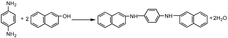 Composed of p-phenylenediamine and β –Obtained from the condensation of naphthol. For p-phenylenediamine andβ-Add naphthol into the autoclave and heat it at 260-265℃Carry out condensation reaction. After the reaction is completed, the reaction product is added to alcohol to reflux, cooled, filtered, washed with ethanol, dried, and pulverized to obtain the finished product.