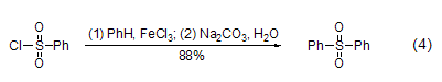 Reacts with aromatic hydrocarbons Under the action of aluminum trichloride or ferric chloride, benzene sulfonyl chloride reacts with aromatic hydrocarbons to form diaryl sulfone (formula 4)[7].
