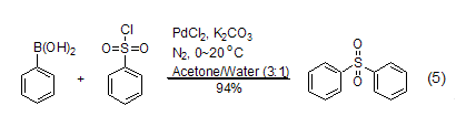 React with phenylboronic acid Under the action of a catalyst such as PdCl2, benzene sulfonyl chloride can react directly with phenylboronic acid to form diaryl sulfone. This reaction is compared with the direct reaction between benzene sulfonyl chloride and aromatic hydrocarbons to form diaryl sulfone. The reaction conditions of base sulfone are milder, and the reaction yield is also higher (Formula 5)[8].