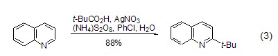 Obtain tert-butyl through oxidative decarboxylation The decarboxylation reaction of carboxylic acids catalyzed by silver peroxodisulfate can produce alkyl radicals, which can be used to convert alkyl radicals into aromatic bases. base. In this process, pivalic acid can serve as a tert-butyl donor, and 2-tert-butylquinoline is regioselectively synthesized through this method (Formula 3)[4].