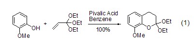 Acid-catalyzed rearrangement Using propionic acid as a catalyst, o-methoxyphenol and triethyl n-acrylate are refluxed in benzene to obtain the Claisen rearrangement ring-closure product. The yield is only 50% because the catalyst is esterified. Using pivalic acid, which is more sterically hindered, as a catalyst, a very high yield can be obtained (Formula 1)[1,2].