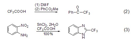 The � group is a group with good lipophilicity and strong electronegativity. It plays a special role in biologically active molecules. Trifluoromethyl group (Formula 2, Formula 3) [6,7] can be introduced into some compound molecules using trifluoroacetic acid.