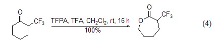 Carboxylate ester SynthesisTrifluoroacetic anhydride reacts with hydrogen peroxide to generate peroxytrifluoroacetic acid, which can be used to cause the Baeyer-Villiger oxidation reaction of some ketones to generate the corresponding carboxylic acid ester (Formula 4)[8] .