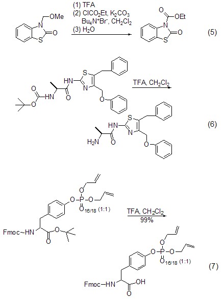 Used for deprotection ReagentsIn organic reactions, in order to selectively carry out a certain reaction while retaining other more active chemical groups (such as amino groups, hydroxyl groups, etc.), it is often necessary to use some protective groups to protect them. Trifluoroacetic acid can easily remove the protective groups of amino and hydroxyl groups [5], for example, N-benzyloxycarbonyl, N -Methoxymethyl (formula 5), N-tert-butoxycarbonyl (formula 6)[9], O-tert-butoxy Carbonyl (formula 7)[10], N-benzyloxymethyl, etc.