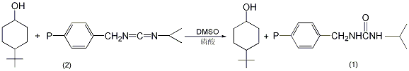 In a reaction flask equipped with a stirrer and ventilation tube , add 540 mg (3.46 mmol) 4-tert-butylcyclohexanol (2), 50 mL anhydrous benzene, and 0.2 mL anhydrous dimethyl sulfoxide containing 98 mg (1 mmol) anhydrous phosphoric acid ①. Pour in nitrogen, add 13.19g of polymer-supported carbodiimide resin (containing 0.012 mol of activated carbon diimide) with stirring, and stir for 3.5 days at room temperature. Filter and wash with ether three times, 100 mL each time. Combine the organic layers and wash with water 5 times, 100 mL each time. Concentrate to dryness to obtain 446-450 mg of product (1), with a yield of 83%-84%. mp42~45℃. Note: ① Anhydrous phosphoric acid is prepared as follows: add 3.98g of phosphorus pentoxide to 5.58mL of 85% phosphoric acid, and heat for 15 minutes to completely dissolve; or add 27mL of water dropwise to 71g of phosphorus pentoxide while cooling in an ice bath. Just dissolve it completely. [2]