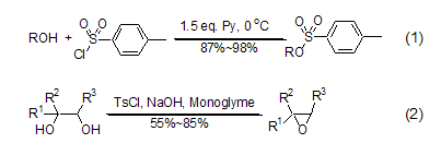 2. The most important use of TsCl in organic chemistry is as a sulfonylation reagent for alcohol compounds. The results of the optimization of reaction conditions show that 1 equivalent of alcohol can be converted into a sulfonylated product (Formula 1) with the highest yield in the presence of 2 equivalents of TsCl and 1.5 equivalents of pyridine. The 1,2-diol compound undergoes an epoxidation reaction under the action of TsCl and alkali (formula 2)[2].