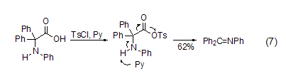 Amino acids under the action of TsCl and pyridine Decarboxylation reaction can occur (Formula 7)[7]. The reaction first generates a sulfonylation intermediate. Under the strong electron-withdrawing effect of the sulfonyl group, intramolecular electron transfer occurs, and a molecule of hydrogen ion and sulfonate is removed to obtain the imine product.