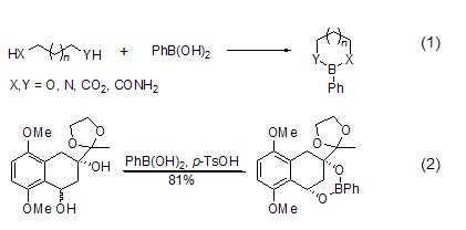 Phenylboronic acid is a commonly used chemical reagent in chemistry laboratories. It can easily form cyclic borate esters (Formula 1) with compounds such as diols or diamines. When X = Y = O, the ability to form ester isn = 3 >2 > 4. The cis cyclic diol can form a 1:1 boronic acid ester with phenylboronic acid, while the trans cyclic diol can form a 1:2 polyester. This property can be used for the separation of cis- and trans- diols (Formula 2)[1].