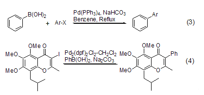 An important reaction in which phenylboronic acid participates is the Suzuki reaction. Under basic conditions and catalyzed by Pd complexes, phenylboronic acid can react with Vinyl-X (X = Br, OTf)[3], Ar-X (X = Cl[4 ], Br, I, OTf) coupling reaction occurs (Formula 3). As an important method for arylation, Suzuki reaction has been widely used in the total synthesis of some natural products (Formula 4)[5]. Phenylboronic acid is often used as a standard reactant to illustrate the advantages and disadvantages of different catalysts in the Suzuki reaction.