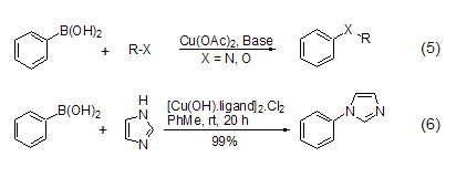 In Cu(OAc)2, phenylboronic acid can generate C-N bonds or C-O bonds (Formula 5) [6,7] to obtain aromatic amines, N em>-aryl substituted heterocyclic compound (formula 6)[8] or diaryl ether, etc. The reaction can proceed smoothly at room temperature using a weak base, which is a significant improvement over the classic Ulmmann arylation reaction and Goldberg reaction.