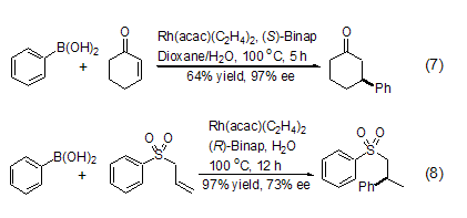 In metal Rh and chiral phosphorus Under the catalysis of ligands, organic boronic acids can undergo 1,4-asymmetric addition reactions with α,β-unsaturated carbonyl compounds. Compared with organometallic compounds, organoboronic acids not only have milder reaction conditions, but also have higher regioselectivity and enantioselectivity (Formula 7, Formula 8)[9,10].