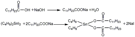 (2) Preparation of finished product Add 1 mol of lauric acid (industrial product) to the reaction kettle, raise the temperature to 60°C with stirring, and slowly add 2.1mol caustic soda is prepared into a 20% solution. After adding the alkali solution, stir for 0.5 to 1 hour, raise the temperature to 80 to 90°C, add 1 mol of di-n-butyltin diiodide, maintain 80 to 90°C, and react for 1.5 to 2 hours. After leaving for 15 to 30 minutes, sodium iodide will precipitate out as a solid, which will be recovered by filtration and then refined. The material from which sodium iodide is separated is distilled under reduced pressure, cooled and filtered to obtain the finished product.