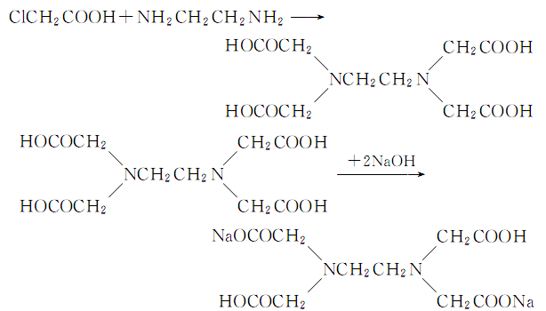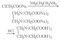 1. In a 1L three-necked flask equipped with a stirrer and thermometer, add 125g chloroacetic acid, 150g ice and 130mL 30% sodium hydroxide solution, and then add 20g ethylenediamine while stirring. After incubation at 15°C for 1 hour, add 30% sodium hydroxide solution in batches of 10 mL each time. After each addition, wait until the phenolphthalein indicator is no longer alkaline before adding the next batch. The final reaction mixture should be alkaline. After keeping at room temperature for 12 hours, heat to 90°C and add activated carbon for decolorization. Filter, wash the filter residue with water, and the total volume after combining the washing liquid and filtrate is about 700 mL. Add concentrated hydrochloric acid to pH=3, crystals will begin to precipitate, filter out the crystals, and wash with water until there is no chloride ion. After drying, the product ethylenediaminetetraacetic acid is about 80g, with a yield of 90%. The reaction formula is as follows: