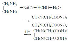 4. React ethylenediamine with formaldehyde and sodium cyanide. Mix 60% ethylenediamine aqueous solution, 30% sodium cyanide aqueous solution and sodium hydroxide Mix and keep mixing at 20°C for 0.5h. Then add formaldehyde aqueous solution dropwise. After the reaction, water was evaporated under reduced pressure. Then repeat the above operation, adding excess formaldehyde for the last time to allow the sodium cyanide to react completely. Adjust the pH to 1.2 with dilute acid. A white precipitate precipitated, filtered, washed with water, and dried at 110°C. Get the product. The reaction formula is as follows: