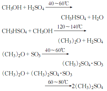 2.React methanol with sulfuric acid to generate methyl hydrogen sulfate, and then continue to react with methanol to generate dimethyl Ether gas reacts with sulfur trioxide to form dimethyl sulfate: