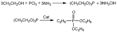 Add absolute ethanol, methyl red and solvent to the reaction kettle, and evenly add the phosphorus trichloride and solvent mixture to the high tank. Pour ammonia gas into the kettle at about 0°C while stirring, and add phosphorus trichloride dropwise at the same time. Adjust the feeding speed of the two to keep the reaction temperature at 0 to 10°C. Complete the dropwise addition of phosphorus trichloride in about 2 to 3 hours. Continue to pass ammonia for a few minutes to make the reactant alkaline (pH 8 to 9). Add water to dissolve the by-product ammonium chloride and a small amount of diethyl phosphite, and let it stand to separate the water layer. The oil layer is fractionated under reduced pressure to recover the solvent. Then use vacuum fractionation to collect triethyl phosphite. The boiling point is 52~53°C (1999.8Pa). , the yield is 70% to 75%. The reaction solvent is preferably petroleum ether at about 90°C. Trichlorethylene, toluene, and xylene can also be used. Triethyl phosphite undergoes an isomerization reaction under the action of a catalyst to produce diethyl ethylphosphonate.