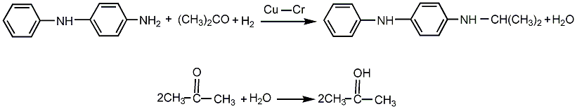 P-Aminodiphenylamine (i.e. RT base) reacts with acetone in the presence of copper-chromium catalyst at 160-165℃ and hydrogen pressure of 5-6MPa. The reactants are filtered while hot to remove the catalyst, and the finished product is obtained by freezing, crystallizing, filtering and drying. Isopropyl alcohol can be recovered by distillation by filtering the mother liquor. Raw material consumption (kg/t) RT Base 875 Acetone 420 Catalyst 12 Hydrogen 60