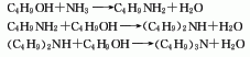 3. Combine butanol and ammonia and hydrogen through a Cu-Ni catalyst with clay as a carrier at 170-200°C to obtain a mixture of three amines, namely n-butylamine, di-n-butylamine and tri-n-butylamine. The product is fractionated to obtain n-butylamine, di-n-butylamine and tri-n-butylamine. Products of butylamine and tri-n-butylamine. Reaction equation: C4H9OH+NH3[H2]→C4H9NH2[C4H9OH]→(C4H9)2NH[C4H9OH]→(C4 H9)3N
