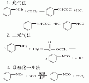In a reaction bottle equipped with a stirrer, thermometer, reflux condenser, and ventilation tube (extending into the bottom of the bottle), add aniline (2) 93g (1.0mol), 1L of toluene, and stir in dry hydrogen chloride gas until saturated to generate aniline hydrochloride. Heat to 70°C and add phosgene until the reaction solution becomes clear. Then fractionate, and collect the fractions at 158-163°C to obtain 99g of phenyl isocyanate (1), with a yield of 83%. [21]