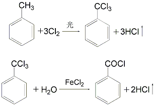 ② Add toluene to the chloride kettle and illuminate it under light Chlorine gas is introduced under the reaction conditions to produce trichlorotoluene, which is then hydrolyzed in an acidic medium to produce benzoyl chloride.