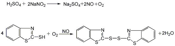 Add 2-mercaptobenzothiazole (see accelerator M) and sodium nitrite into the gas phase bubble tower, add 10% sulfuric acid solution dropwise, and bubble in air. Control the reaction temperature at about 60°C. After the sulfuric acid is added dropwise, air is continued to be blown in, and the temperature is maintained at 60°C until the reaction is complete.