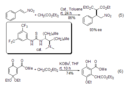 strong> The carbanion formed by diethyl malonate methylene can react with α,β-unsaturated carbonyl compounds (or analogs) to produce 1,4- Conjugate addition reaction (Formula 5, Formula 6)[9~12].