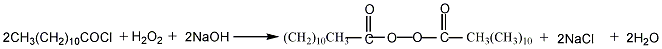 Lauroyl chloride (3): In a reaction bottle equipped with a stirrer, thermometer, and reflux condenser, add 44.1g (0.22mol) of newly distilled lauric acid (2). 11g of phosphorus trichloride (0.08mol) was stirred and reacted at 50°C for 1 hour. Pour off the upper layer and remove volatile components with a stream of dry air. Distill under reduced pressure and collect the fraction at 138~142℃/2.0kpa to obtain 45.9g of lauroyl chloride with a yield of 95%. Dodecanoyl peroxide (1): Add 100 mL of petroleum ether at 30 to 60°C, an appropriate amount of crushed ice, and 20 g of sodium peroxide into the reaction bottle, then add a solution of compound (3) dissolved in 100 mL of petroleum ether, and shake vigorously for 2 minutes. . Add 15g sodium peroxide and more crushed ice and shake for 15 minutes. Transfer to a separatory funnel, add diethyl ether to allow dodecanoyl peroxide to enter the organic layer. The organic layer was separated, washed with water, dried over anhydrous sodium sulfate, and the solvent was evaporated under reduced pressure at room temperature to obtain a waxy white solid (1). Dry in a fast dryer filled with sodium hydroxide to obtain 35.5g of product (1) with a yield of 85%. [1]
