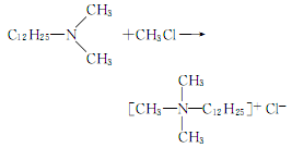 2.Put 430kg dodecyldimethyl tertiary amine into the reaction kettle, add a certain amount of isopropyl alcohol and water, and use alkali as a catalyst , after the air is replaced in the pressure kettle, the temperature is gradually raised and 111kg of methyl chloride is introduced, and the reaction is carried out at a pressure of 0.2 to 0.3MPa for 4 hours. After cooling to normal pressure, the material is discharged and filled. The reaction formula is as follows.