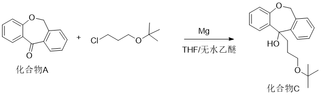 (5) Add magnesium powder to 6,11-dihydrodibenzo[b,e]oxepin-11-one (compound A) and 3-chloropropyl tert-butyl ether (compound B) And perform a nucleophilic addition reaction using THF and/or anhydrous ether as solvents to obtain a hydroxyl compound (compound C). The reaction formula is as follows,