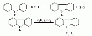First, the potassium salt is made by reacting carbazole and sodium hydroxide at 270℃ ; Then, ethyl chloride is introduced at 215°C and 0.98MPa for ethylation; after the reaction is completed, the product is obtained by distillation.