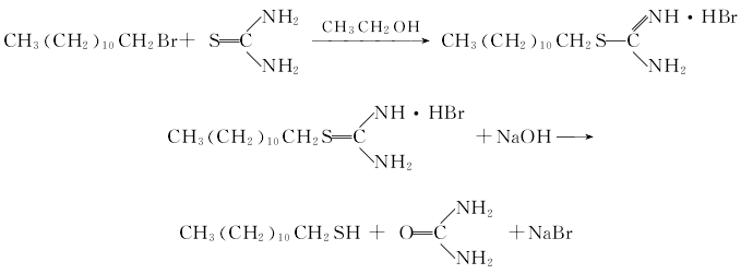 3. Heat dodecyl bromide, thiourea and 95% ethanol to reflux reaction, then add sodium hydroxide solution and heat. After the reaction is completed, cool and let stand for layering. The oil layer is crude mercaptan. The crude product is washed, dried, distilled, and distilled under reduced pressure to become the finished product.