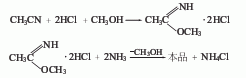 Brief description of production method: It is obtained by addition and amination of acetonitrile, hydrochloric acid and methanol. Circulate methanol in the turbulent ball tower with a pressure of less than 26.6kPa. Dry hydrogen chloride is introduced under cooling to prepare a hydrogen chloride methanol solution with a concentration of 45%. Then put it into the reaction tank, stir and cool to 10-5°C, add acetonitrile dropwise, and keep it at 15-20°C for 6 hours to obtain iminomethyl ethyl ether hydrochloride. Put it into the pre-prepared 13% ammonia methanol solution, ammonolyze it at 0-40°C, keep the pH value at 7-8, stir for 2-3 hours, cool down to below 30°C, centrifuge and filter out the ammonium chloride. Methanol is recovered from the filtrate, and the finished product is obtained by cooling and filtering. Weight input ratio: acetonitrile: hydrogen chloride methanol solution (45%): ammonia: methanol = 1:3:1.05:4.3. The yield is 82%-85%.