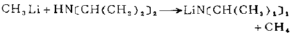 3. In 250 ml of dry A round bottom flask or a dry Schlenk tube of about 250 ml is equipped with a rubber septum, a pressure reducing valve is installed on the rubber septum and an injection needle is inserted. Place the container in an ice bath to cool, purge it with oxygen-free nitrogen (Note 1) through the needle, and keep the container slightly positive during the reaction. First, remove 2.53 grams (y ml, 25.0 mmol) of pure diisopropylamine from the syringe. (Note 2) A solution dissolved in 25 ml of anhydrous ether (Note 3) was poured into the bottle. Then add dropwise an ether solution containing 2.53 mmol of methyl rhomium from the syringe under electromagnetic stirring. During this addition, methane is released violently. When the diisopropylamino raspide is stirred at 0°C for 5 to 10 minutes, check the methyl cannium The Gilman color test showed a negative reaction.