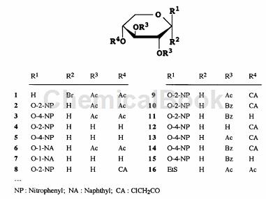6) At 0°C, to a stirred mixture of 11 (1.76g, o3.7mmol), 16 (1.53g, 4.8mmol) and powdered 4A molecular sieve, add CH2Cl2 (30mL ), add NIS (1.06g, 4.8mmol)), and then add dropwise a solution of silver triflate (0.19g, 739/zmol) in PhMe (5mL). After 10 minutes, filter the mixture through a diatomaceous earth layer into ice water and distribute the filtrate. The organic layer was washed successively with Na2S2O3 aqueous solution, NaHCO3 aqueous solution and H2O, dried and concentrated. Column chromatography of the product (10:1PhMe-EtOAc) gave 2-nitrophenyl O-(2,3,4-tri-O-acetyl-fl-D-xylopyranosyl)-(1~4 )-2,3-di-O-benzoyl-fl-D-pyranopyranoside (17) (2.17 g, 80%): mp 175-176°C.