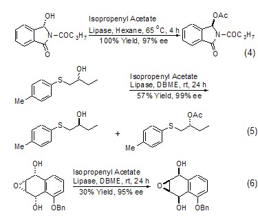Isopropylene acetate in biology Acetyl transfer reactions with hydroxyl compounds under enzymatic conditions have become an important application of this reagent. By selecting appropriate biological enzymes and catalytic conditions, the result of a single enantiomer can be obtained (Formula 4)[6,7]. Sometimes the reaction speed of this reaction is very different from that of the enantiomers, so it can be used for the chiral kinetic resolution of alcohol compounds (Formula 5)[8]. An interesting result is that under enzyme-catalyzed conditions, when isopropylene acetate undergoes an acetyl transfer reaction, multiple chiral centers in the molecule are all transformed (Formula 6)[9].