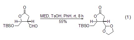 The acetal exchange reaction between MED and aldehydes occurs in the presence of acid catalyst to generate new ethylene glycol acetal. p-Toluenesulfonic acid or camphorsulfonic acid are the most commonly used catalysts for this reaction. Compared with directly using ethylene glycol to heat dehydration under acidic conditions, the reaction can be carried out under very mild conditions. In most cases, it can be completed by stirring at room temperature for several hours, which is very important for substrates with acid-sensitive functional groups (Formula 1)[1,2].