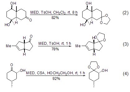 Under almost the same conditions, MED conveniently converts ketones into ethylene glycol ketals. CH2Cl2 or benzene are the most commonly used reaction solvents, and tertiary alcohols with high acid sensitivity are not significantly affected under these conditions (Formula 2)[3,4]. This reaction can also use excess MED as the reaction solvent (Formula 3)[5]. The recommended method is to use excess MED and add a small amount of ethylene glycol as a catalyst to obtain a better yield (Formula 4)[6,7].