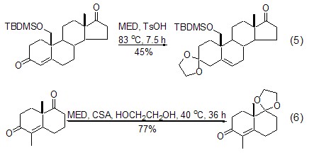 With dimethyl-1, Compared with 3-dioxolane, MED has higher regioselectivity in the reaction with substrates containing multiple ketone functional groups. The influence of the structure of the substrate on selectivity mainly comes from the influence of steric hindrance of the ketone functional group. Six-membered rings are preferred to five-membered rings (Formula 5)[8,9], and smaller steric hindrances are preferred to larger steric hindrances (Formula 6)[10,11].